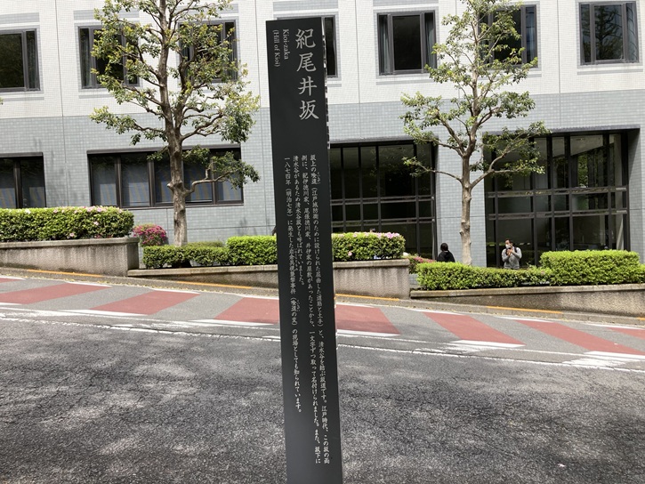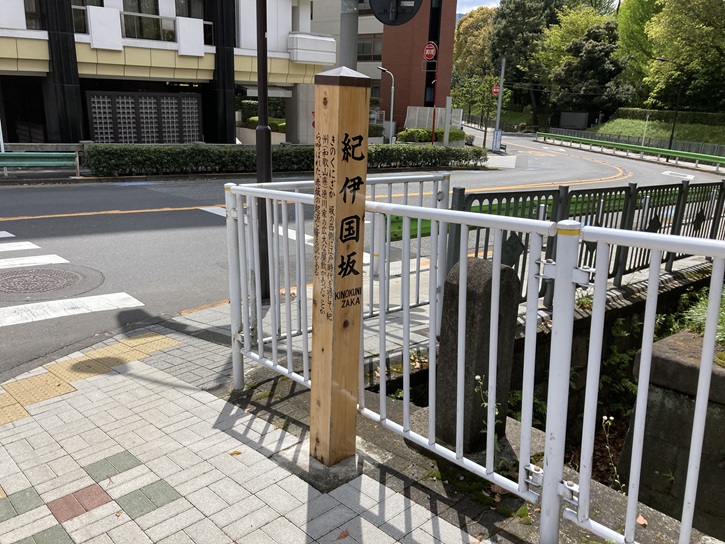 紀伊国坂は長さが約340mほどの右に曲がりながら緩やかに下る坂で、別名を「紀国坂」といいます。坂名は、江戸時代に坂の西側に紀州徳川家の屋敷があったことに由来します。紀州が「紀の国」と呼ばれたことから、屋敷に上る坂を「紀之国坂」と呼ぶことになったとのことです。また、紀州徳川家の屋敷が「赤根山」と呼ばれていたことから、「赤根山の坂」が短縮されて「赤坂」の地名が付いたともいわれています。但し、諸説があって本当のところは分かりません。