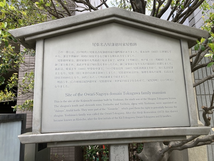 This is the site of the Kojimachi mansion built by Yoshinao, the ninth son of the Shogun Tokugawa Ieyasu. The shogun's tenth and eleventh sons, Yorinobu and Yorifusa, along with Yoshinao, were appointed as “daimyo", feudal lords. They were part of the "Gosan-ke" which gave them the right to potentially become the