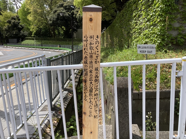 きのくにざか 坂の西側に江戸時代を通じて、紀州(和歌山県)徳川家の広大な屋敷があったことから呼ばれた。赤坂の起源とする説がある。