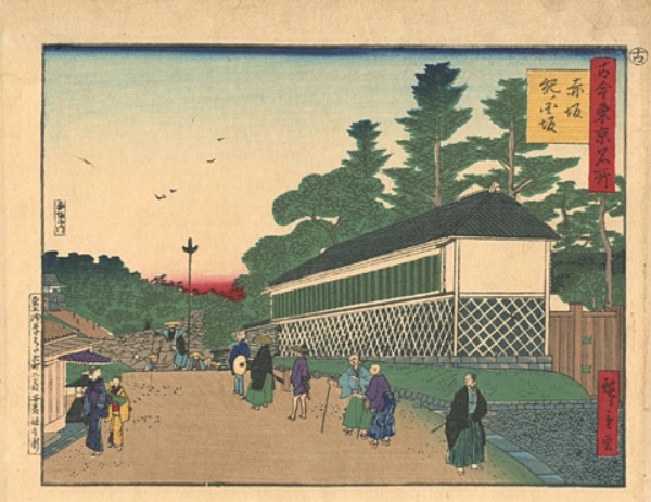 三代歌川広重の作品「古今東京名所 赤坂紀ノ国坂」は、赤坂迎賓館の東門附近から赤坂見附へと下る紀伊国坂の風景を描いたものです。左が「古今東京名所 赤坂紀ノ国坂」の原画、右の写真は同じ構図で弁慶濠方向を眺めた風景です。
