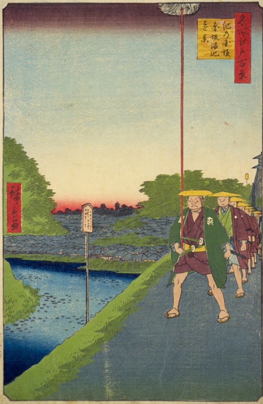 紀伊国坂を弁慶橋方面に下る途中(元赤坂1丁目)付近。高速道路が架かっていても、弁慶濠とカーブを描いた地形は今も変わらない。本図の大名行列は紀伊殿のようだ。