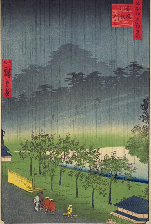 二代目歌川広重の作品「名所江戸百景 赤坂桐畑雨中夕けい」は、現在の赤坂見附交差点付近の雨に包まれる赤坂御門を描いたものです。画に描かれた池は、位置関係からして弁慶濠ではないかと思われます。池の向こうの鬱蒼とした森は、赤坂見附(御門)の内にある紀伊徳川家上屋敷です。左は「赤坂桐畑雨中夕けい」の原画、右の写真は新坂の坂下から赤坂御門跡の方向を眺めたものです。