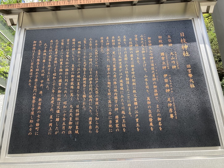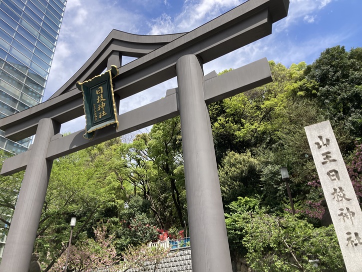 山王日枝神社は東京十社の一社で、江戸三大祭のひとつである山王祭が行われることで知られています。山王日枝神社の創建年代ははっきりしていませんが、文明十年(1478年)に太田道灌が江戸城築城に当たって川越の無量寿寺(現在の喜多院・中院)の鎮守である川越日枝神社を勧請したことに始まるといわれています。徳川家康が江戸に移封された際に、城内の紅葉山に遷座して江戸城の鎮守としました。慶長九年(1604年)に始まった徳川秀忠による江戸城改築の際に社地を江戸城外の麹町隼町に遷座し、庶民が参拝できるようになりました。明暦三年(1657年)の明暦の大火によって社殿が焼失したため、万治二年(1659年)に将軍家綱が赤坂の松平忠房の邸地を社地に当て、現在の地に遷座しました。この地は江戸城から見て裏鬼門に位置します。日枝神社は元々は比叡山の山の神様「山王」で、「日枝」は「比叡山」の「ひえ」に由来します。なので「山王」と「日枝」は同じ意味です。比叡山にある総本山は「日吉大社」で、昔は「日吉」と書いて「ひえ」と呼んでました。