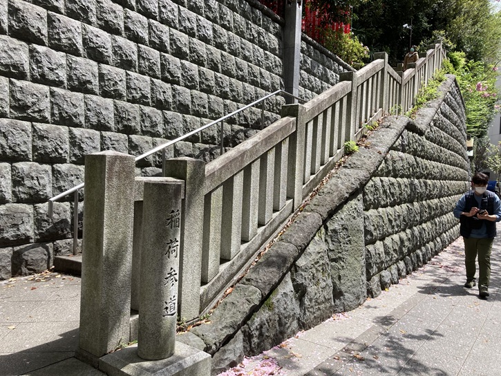 神門から山王男坂を下ります。山王男坂は長さが約30mほどの急な石段で、山王日枝神社の表参道になります。外堀通りに面した階段とエスカレーターは山王橋参道で、この他に朱色の千本鳥居が連なる稲荷参道があります。山王日枝神社に上る坂のうち、正面の急な坂であることから、別名男坂のとも呼ばれます。