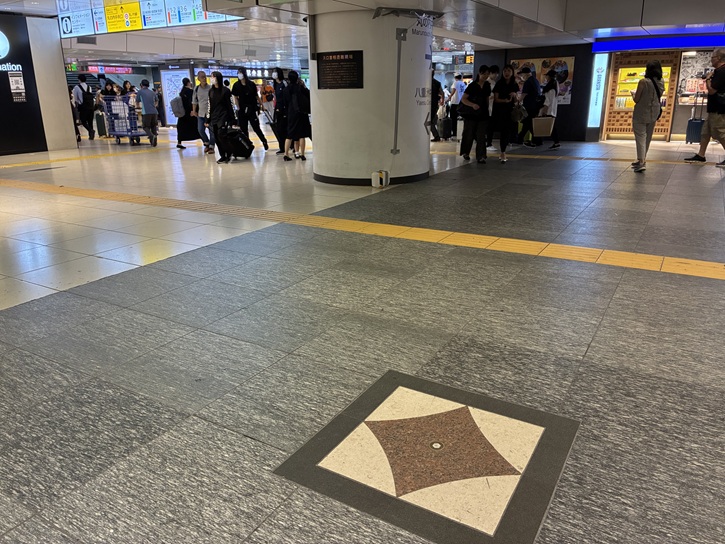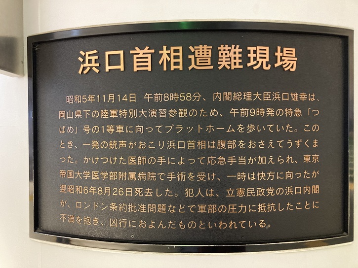 と、その前に浜口雄幸首相襲撃事件の現場を見ておきます。ロンドン海軍軍縮条約の枢密院審議を乗り切った浜口内閣でしたが、昭和五年(1930年)11月14日、統帥権干犯に憤った右翼青年佐郷屋留雄によって浜口が狙撃されました。浜口は一命を取りとめましたが、重傷だったために内閣は幣原外相を首相代理として第59議会に臨みました。ところが、政友会は首相不在や幣原が政党員でないことを取り上げて政府を攻撃しました。こうした最中に、ロンドン条約をめぐって幣原が天皇に責任を転嫁するような発言をしたとして議会が紛糾しました。この失言問題が決着すると、浜口首相の議会出席が政治問題化しました。政友会が首相の出席を強く求め、予算審議を拒否したため(予算は成立)、事態を重大視した浜口は病身を押して議会に出席しました。衆議院の大木書記官の日誌にはこの時の浜口と鳩山一郎との質疑応答の模様が記されています。しかし以後健康状態は悪化し、4月14日に浜口は首相を辞職し、第二次若槻礼次郎内閣が成立しました。その4ヶ月後の8月26日に浜口は62歳の生涯を閉じました。現場となったホームは修復・改造工事などにより失われ、中央通路の一部となりました。この通路の途中の新幹線中央乗り換え口への階段近くの柱に事件概要を伝えるプレートがあります。