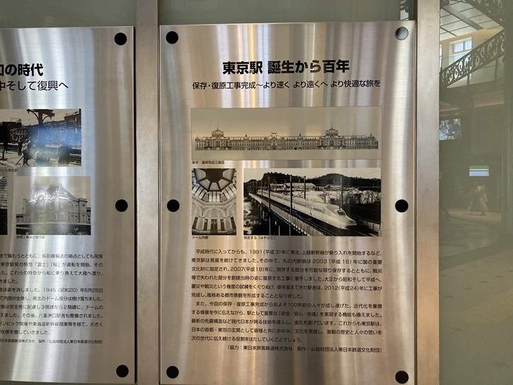 平成時代に入ってからも、平成三年(1991年)に東北・上越新幹線が乗り入れを開始するなど、東京駅は発展を続けてきました。その中で、丸の内駅舎は平成十五年(2003年)に国の重要文化財に指定され、平成十九年(2007年)に、現存する部分を可能な限り保存するとともに、戦災等で失われた部分を創建当時の姿に復原する工事に着手しました。大正から昭和そして平成へ、震災や戦災という幾度の試練をくぐりぬけ、姿を変えてきた駅舎は、平成二十四年(2012年)に工事が完成し、風格ある都市景観を形成することとなりました。また、今回の保存・復原工事完成からおよそ100年前の人々が成し遂げた、近代化を象徴する偉業を今に伝えながら、駅として重要な「安全・安心・快適」を実現する機能も備えました。最新の免震構造など現代日本が誇る技術を導入し、進化を遂げています。これからも東京駅は、日本の首都・東京の玄関として皆様と共にあゆみ、文化を発信し、激動の歴史と人々の思いを次の世代に伝え続ける役割をはたしていくことでしょう。