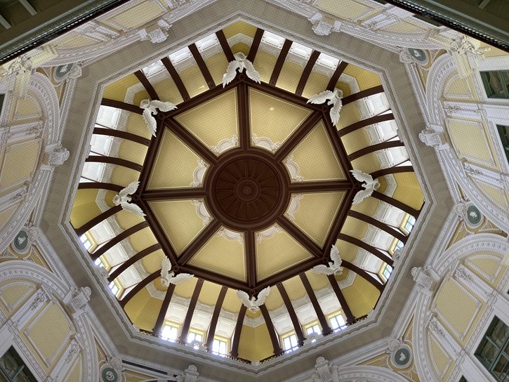 また、ドームに沿って2階と3階に回廊が設けられています。3階の回廊部分にはゴシック風の細長い窓が立ち上がり、その上には半円形のアーチ模様が設けられています。アーチとアーチの間には、淡いグリーンの地に十二支のうち八支が彫刻させたメダリオンが配置されています。回廊は、東京ステーションホテルの施設で、3階部分は宿泊者専用ですが、2階部分は宿泊者以外でも上ることができます。