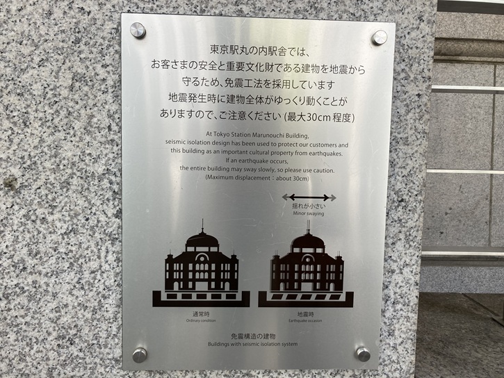 At Tokyo Station Marunouchi Building, seismic isolation design has been used to protect our customers and this building as an important cultural property from earthquakes. If an earthquake occurs, the entire building may sway slowly, so please use caution. (Maximum displacement about 30cm)
