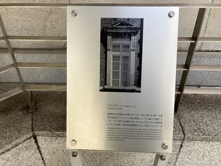 創建時の外部建具は木製であったが、今回工事では水密・気密等の性能及びメンテナンス性を考慮して、アルミ製にて復原している。ガラス厚さも創建時と同じ3mmとしており、ホテル客室等については遮音・断熱性能等確保のため、二重サッシとしている。