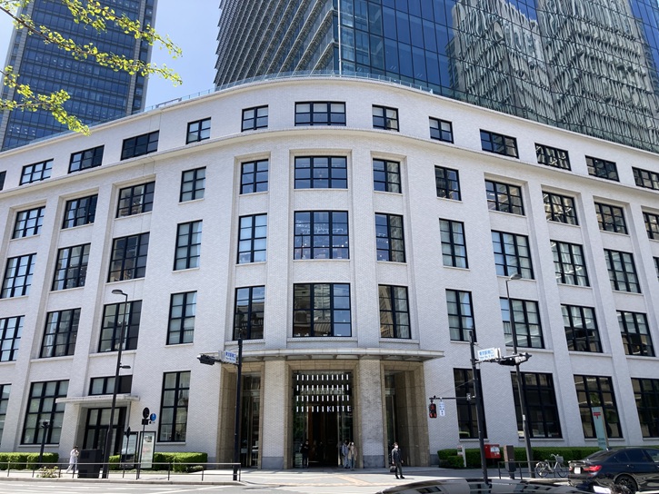 東京駅丸の内広場の左手には東京中央郵便局、正面には丸ビルと新丸ビル、右手には東京駅の駅舎があります。いずれも建替えられていて(東京駅は改築)、現在はどれも真新しい建物に変わっています。東京中央郵便局は、平成二十四年(2012年)に「JPタワー」として、地上38階・地下4階・高さ約200メートルの超高層ビルになりました。旧局舎の特徴だったなだらかな曲面を持つ外壁の保存を巡って論争が起き、平成二十一年(2009年)に当時の鳩山邦夫総務相が局舎の文化財としての価値を理由に建築計画を問題視し、旧局舎の解体工事を急きょ停止した後、建物外観の保存部分を大きく増やすことで決着しました。当初は無駄な保存と思っていたのですが、今となっては周囲の景観にしっくりと調和しているように思えます。
