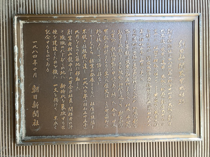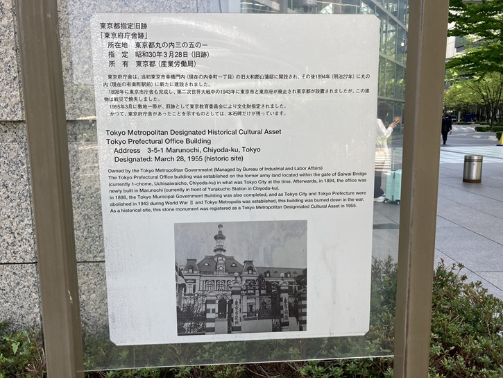 東京国際フォーラムの建物の角に旧都庁舎の石碑が建っています。石碑には、「東京府廳舎」と書かれています。