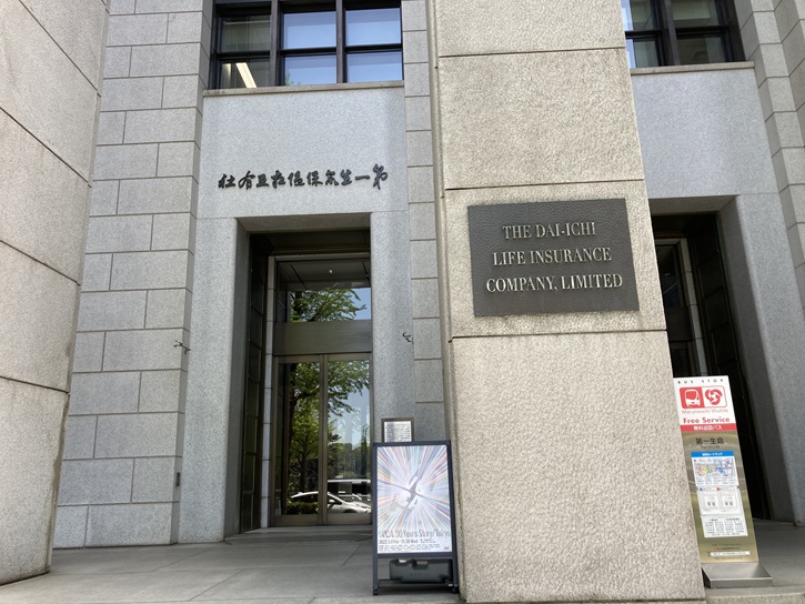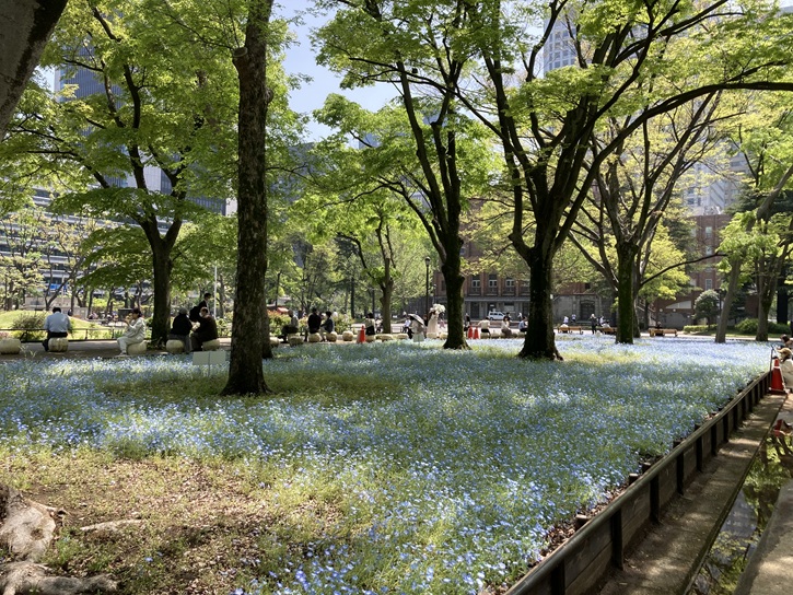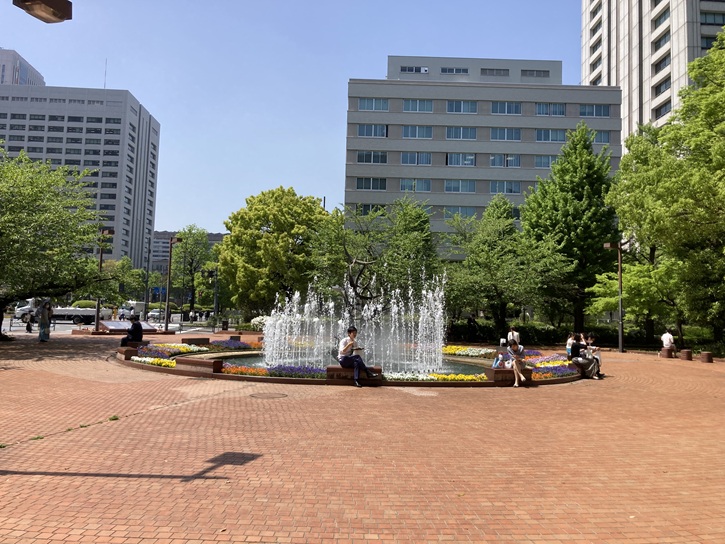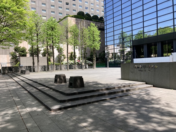 芝生広場からは、日比谷の高層ビルが一望の下に見渡せます。東京ミッドタウン日比谷は、三井不動産が手掛ける東京都心部における複合用途型の街づくりブランド「東京ミッドタウン」の第二弾として開発され、2018年3月29日にオープンしました。東京ミッドタウン日比谷は、地下4階・地上35階建てで、地下1階〜地上7階は商業フロア、6階の一部と9階〜34階がオフィスフロアで構成されています。高層部は高透過ガラス組み込みのユニット型アルミカーテンウォールで、255mmの平面段差を持つプリーツ形状が外部の堅型アルミフィンとの相乗効果で建物に繊細で優雅な陰影をもたらすと共に、熱負荷低減にも役立っています。曲線を使った「ダンシングタワー」というコンセプトは、近くの内幸町にかつて存在した鹿鳴館を意識しています。
