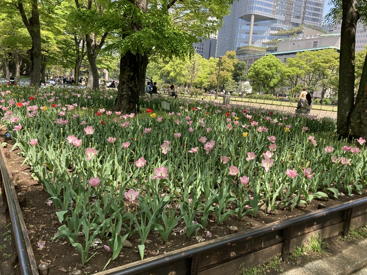 江戸時代から花卉園芸は大衆の趣味でしたが、明治に入って西洋の美しい花を愛でることで、新たな展開を見せ始めます。日比谷公園は市民が洋花を見ることができる数少ない場所でした。洋花を提供(?)した第一花壇は公会堂予定地を利用してつくられたものですが、洋風花壇にはチューリップ、パンジー、バラ、ダリアなど、初めて見る洋花が数多く植えられ、人気が高くそのまま今に残されることになります。この間、関東大震災後は花壇にも被災者のバラックが並んだり、2.26事件のときは花壇脇に据えた野戦重砲の射程の邪魔になるとして、シュロの木が伐採されたりしました。一方、ここでは昭和五年(1930年)を第1回目として花壇展覧会が催され、昭和二十六年(1951年)からは野外創作彫刻展も行われました。