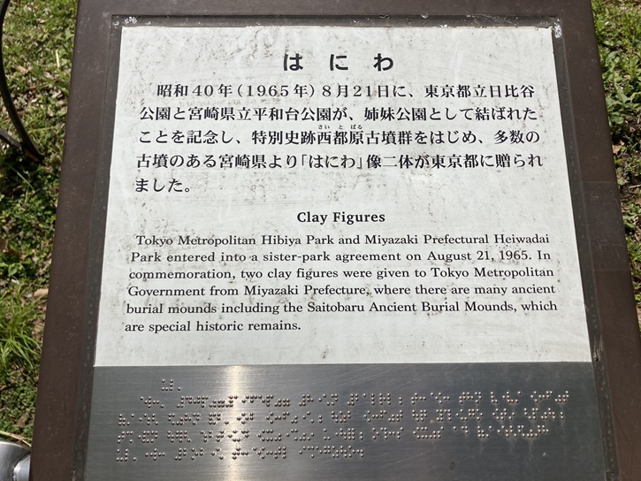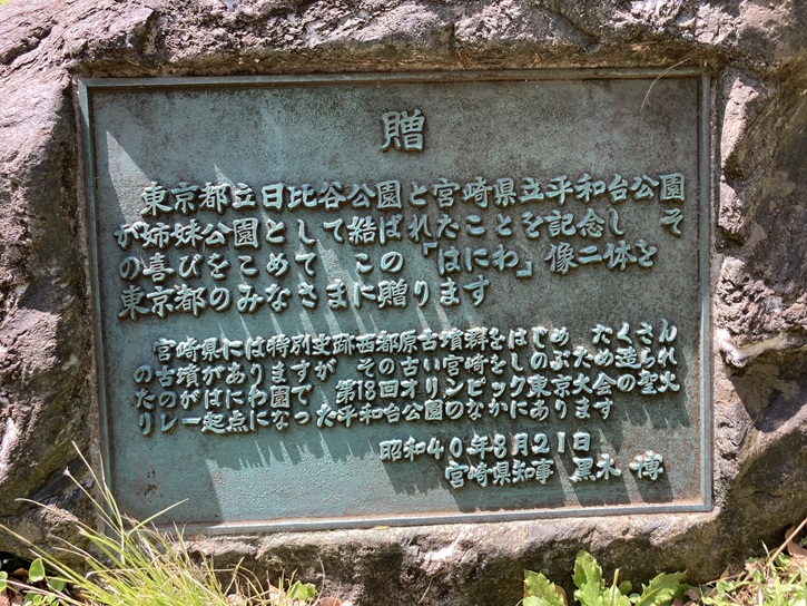 昭和四十年(1965年)8月21日に、東京都立日比谷公園と宮崎県立平和台公園が、姉妹公園として結ばれたことを記念し、特別史跡西都原古墳群をはじめ、多数の古墳のある宮崎県より「はにわ」像二体が東京都に贈られました。