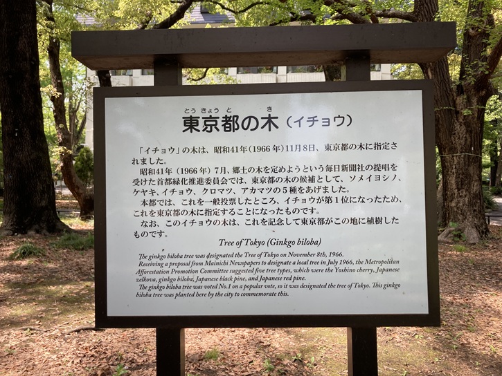 れました。昭和四十一年(1966年)7月、郷土の木を定めようという毎日新聞社の提唱を受けた首都緑化推進委員会では、東京都の木の候補として、ソメイヨシノ、ケヤキ、イチョウ、クロマツ、アカマツの5種をあげました。本都では、これを一般投票したところ、イチョウが第1位になったため、これを東京都の木に指定することになったものです。なお、このイチョウの木は、これを記念して東京都がこの地に植樹したものです。