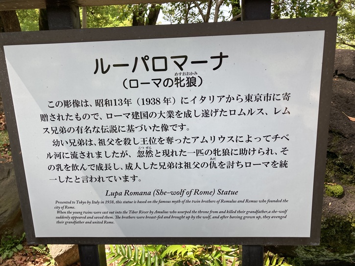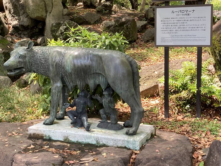 この彫像は、昭和十三年(1938年)にイタリアから東京市に寄贈されたもので、ローマ建国の大業を成し遂げたロムルス、レムス兄弟の有名な伝説に基づいた像です。幼い兄弟は、祖父を殺し王位を奪ったアムリウスによってチベル河に流されましたが、忽然と現れた一匹の牝狼に助けられ、その乳を飲んで成長し、成人した兄弟は祖父の仇を討ちローマを統一したと言われています。