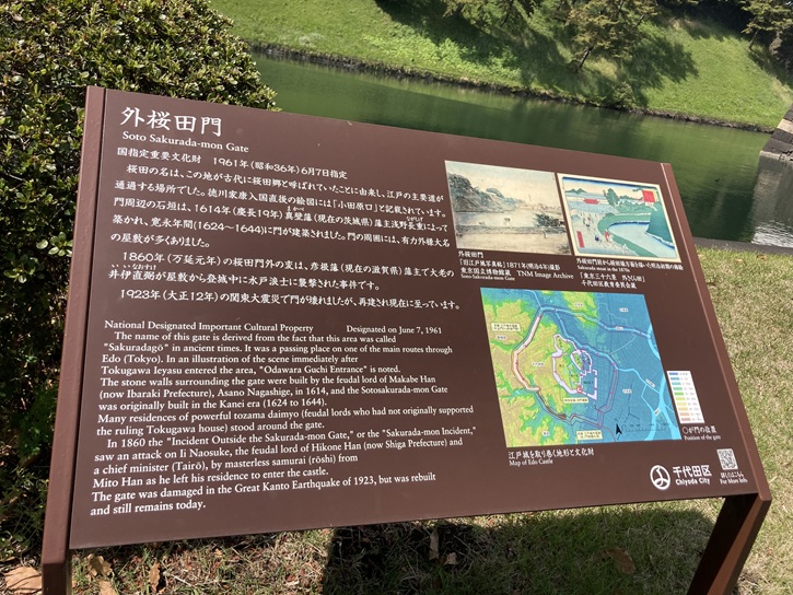 called Sakurada-go (town) in the past. The Sotosakurada-mon Gate has a dual structure consisting of the Korai Gate on the outside and the Watariyagura Gate on the inside with a square in-between. It covers an exceptionally large area (approx. 1,056 sqm) as a highly defensive castle gate for the Nishinomaru (west compound). The Sotosakurada-mon Gate was originally built in the Kanei era (1624 to 1644), while the existing gate is based on a gate reconstructed in 1663. The gate was damaged by the Great Kanto Earthquake in 1923 and repaired it. On March 3, 1860, the Japanese Chief Minister Tairo li Naosuke was assassinated by a group of samurai who seceded the Mito-han feudal state outside of the Sotosakurada-mon Gate in an event known as the Sakuradamon Incident.