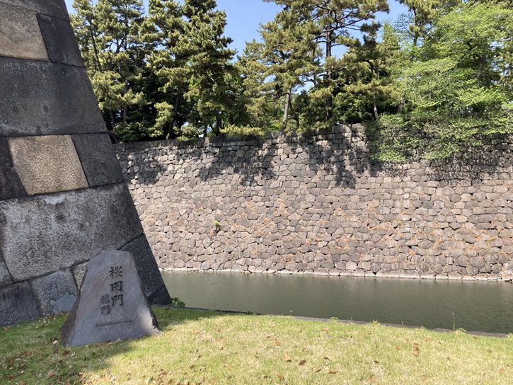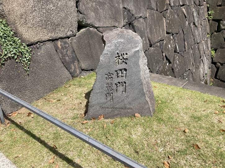 桜田の名は、この地が古代に桜田郷と呼ばれていたことに由来し、江戸の主要道が通過する場所でした。徳川家康入国直後の絵図には「小田原口」と記載されています。門周辺の石垣は、慶長十九年(1614年)真壁藩(現在の茨城県)藩主浅野長重によって築かれ、寛永年間(1624年〜1644年)に門が建築されました。門の周囲には、有力外様大名の屋敷が多くありました。万延元年(1860年)の桜田門外の変は、彦根藩(現在の滋賀県)藩主で大老の井伊直弼が屋敷から登城中に水戸浪士に襲撃された事件です。大正十二年(1923年)の関東大震災で門が壊れましたが、再建され現在に至っています。