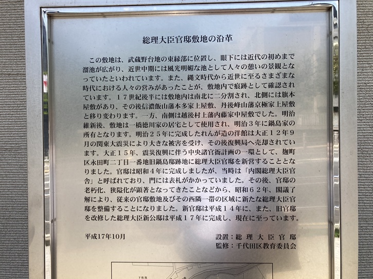 首相官邸の敷地は、17世紀の後半は敷地内南側が越後村上藩内藤家中屋敷で、敷地内北側は旗本屋敷から信濃飯山藩本多家上屋敷、丹後峰山藩京極家上屋敷へと移り変わりました。明治維新後、一時期一橋徳川家が使用し、明治三年に鍋島家の所有となりました。鍋島邸は関東大震災により大きな被害を受け、復興局へ売却されました。大正十五年(1926年)に震災復興に伴う中央諸官衙計画の一環として、旧鍋島邸跡地に総理大臣官邸を新設することとなり、昭和四年(1929年)に完成しました。当時は「内閣総理大臣官舎」と呼ばれ、門には表札がかかっていました。