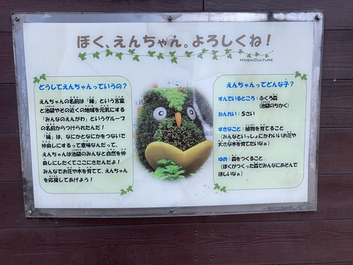 えんちゃんの名前は「縁」という言葉と池袋やその近くの地域を元気にする「みんなのえんがわ」というグループの名前からつけられたんだ!「縁」は、なにかとなにかをつないで仲良しにするって意味なんだって。えんちゃんは池袋のみんなと自然を仲良しにしたくてここにきたんだよ!みんなでお花や木を育てて、えんちゃんを応援してあげよう!