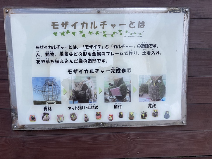 モザイカルチャーとは、「モザイク」と「カルチャー」の造語です。人、動物、風景などの形を金属のフレームで作り、土を入れ、花や草を植え込んだ緑の造形です。