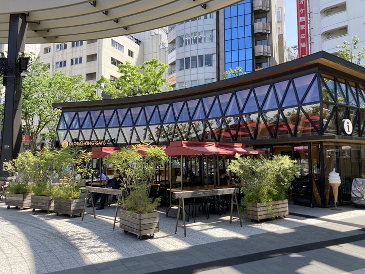 ○海外の来街者を迎え入れるためインフォメーション機能を持つカフェがあります。