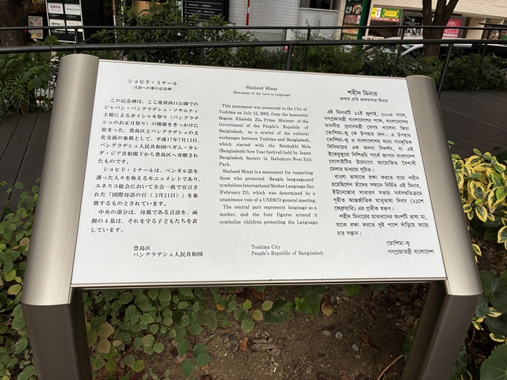 この記念碑は、ここ池袋西口公園でのジャパン・バングラデシュ・ソサエティ主催によるボイシャキ祭り(バングラデシュのお正月祭り)の開催をきっかけに始まった、豊島区とバングラデシュの文化交流の象徴として、平成十七年7月12日、バングラデシュ人民共和国ベガム・カレダ・ジア首相閣下から豊島区へ寄贈されたものです。ショヒド・ミナールは、ベンガル語を護った人々を称えるモニュメントであり、ユネスコ総会において全会一致で宣言された「国際母語の日(2月21日)」を象徴するものとされています。中央の部分は、母親である言語を、両側の4基は、それを守る子どもたちを表しています。