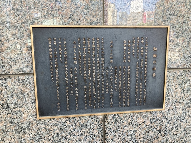 ここはかつて東京鉄道教習所があり、広大な敷地に校舎、大講堂、図書館、プール、寄宿舎など立派な施設が完備され、多数の鉄道マンが勉学にいそしんだ場所である。