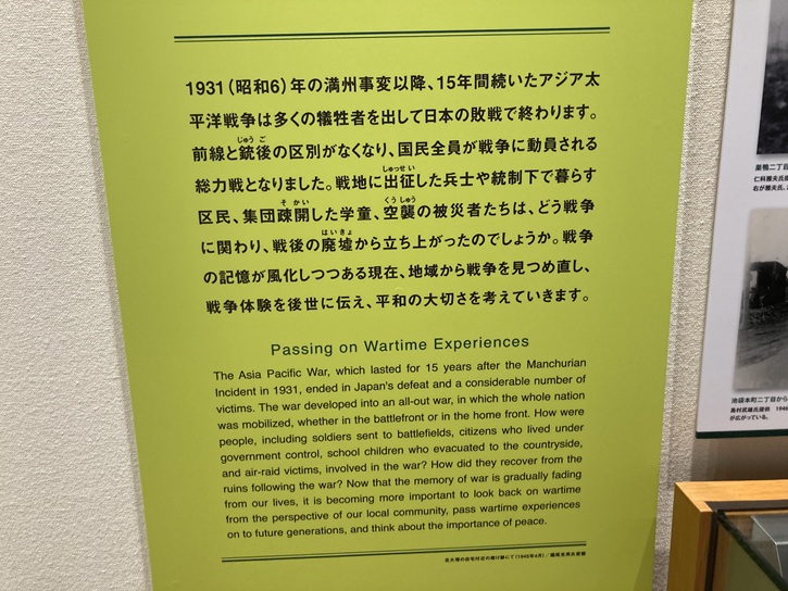 昭和六年(1931年)の満州事変以降、15年間続いたアジア太平洋戦争は多くの犠牲者を出して日本の敗戦で終わります。前線と銃後の区別がなくなり、国民全員が戦争に動員される総力戦となりました。戦地に出征した兵士や統制下で暮らす区民、集団疎開した学童、空襲の被災者たちは、どう戦争に関わり、戦後の廃墟から立ち上がったのでしょうか。戦争の記憶が風化しつつある現在、地域から戦争を見つめ直し、戦争体験を後世に伝え、平和の大切さを考えていきます。