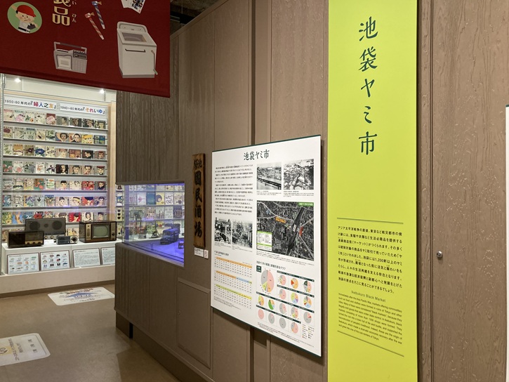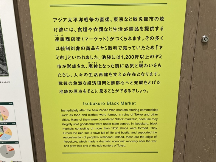 Immediately after the Asia Pacific War, markets offering commodities such as food and clothes were formed in ruins of Tokyo and other cities. Many of them were considered "black markets", because they illegally sold goods that were under state control. In Ikebukuro, black markets consisting of more than 1200 shops were formed. They turned the ruin into a town full of life and bustle, and supported the reconstruction of people's livelihood. Indeed, these are the origin of Ikebukuro, which made a dramatic economic recovery after the war