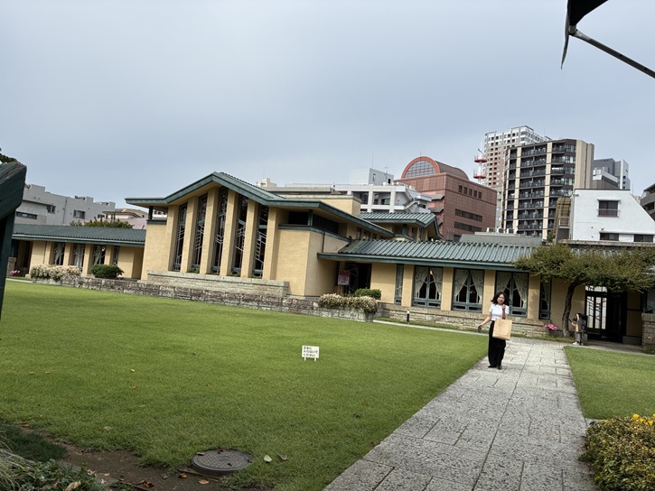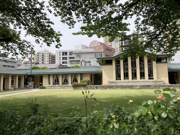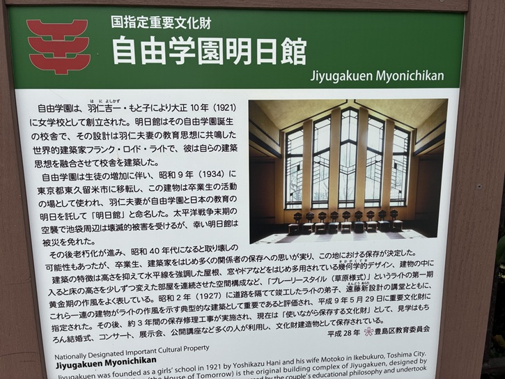 world-renowned architect Frank Lloyd Wright. He was impressed by the couple's educational philosophy and undertook the design by incorporating it with his own architectural philosophy. Jiyugakuen was relocated to Higashikurume City in 1934 due to growing number of students and the original complex was since used by school alumni for various activities. The Hanis then named it as "Myonichikan" by committing to tomorrow's education, both in Jiyugakuen and in Japan. The areas around Ikebukuro were devastated by the air raids at the end of World War II, but fortunately, Myonichikan escaped the disaster. Demolition became an issue in the mid-1960s as aging advances, but it was finally determined to be conserved where it is, thanks to support from the alumni, architects and many others concerned. Characteristics of the buildings well represent the so-called "Prairie House" style which can be seen in Wright's first golden age, such as the geometric design frequently used in the roofs, windows, doors, etc., emphasizing the horizontal lines with reduced height, and the spatial configuration inside the buildings with the rooms arranged in succession by a little changing floor height. On May 29, 1997, a series of the buildings including the auditorium across the street designed and completed by Arata Endo,