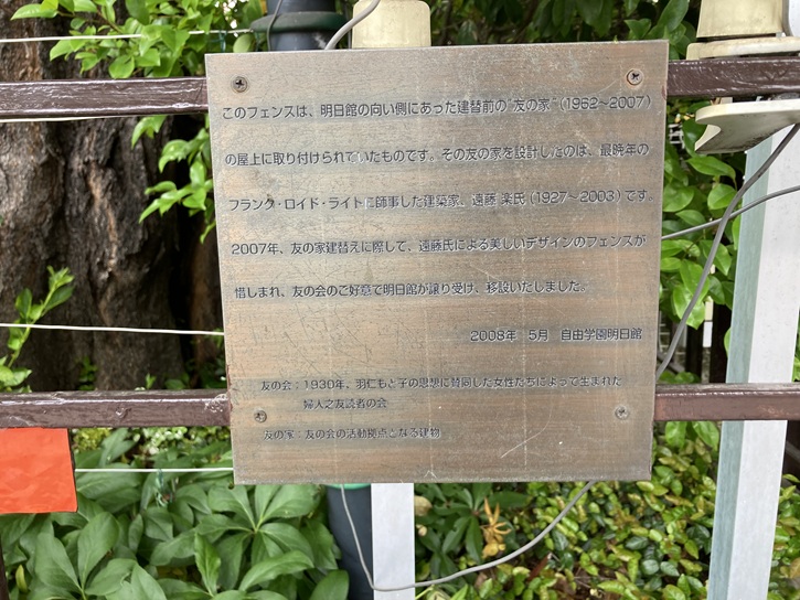 このフェンスは、明日館の向い側にあった建替前の”友の家”(1962年〜2007年)の屋上に取り付けられていたものです。その友の家を設計したのは、最晩年のフランク・ロイド・ライトに師事した建築家、遠藤楽氏(1927年〜2003年)です。2007年、友の家建替えに際して、遠藤氏による美しいデザインのフェンスが惜しまれ、友の会のご好意で明日館が譲り受け、移設いたしました。