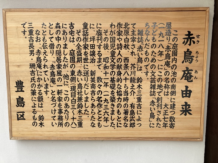 この庭園内の池の南側に建つ数寄屋造り「赤鳥庵」の名称は、大正七年(1918年)にこの地で創刊された子どものための文芸雑誌「赤い鳥」にちなんだものです。雑誌「赤い鳥」は、鈴木三重吉によって主宰され、芥川龍之介、有島武郎、北原白秋、西条八十ら当時の著名な作家や詩人の献身的な協力のもとにわが国児童文学の基礎を築きました。その後、昭和十一年(1936年)に廃刊するまで、数々の名作とともに、坪田譲治、新美南吉らあらたな童話作家を世に送りだしました。その全盛期、赤い鳥社兼鈴木三重吉宅は、庭園の東側(現目白三〜十八)にありましたが、他に、このあたりの森の中の隠居家風の一軒家を事務所として借り、「赤鳥庵」と名づけていたとも伝えられています。なお、「赤鳥庵」にかかる額は、鈴木三重吉長男・珊吉氏の筆によるものです。