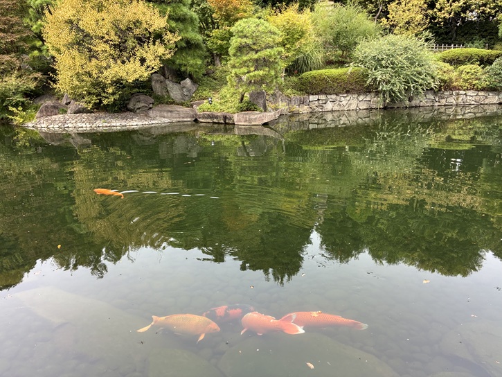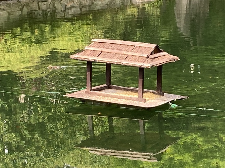 池の中央にはカルガモが暮らす鳥小屋が設置され、毎年5月になると親子が姿を見せて庭園のアイドルとなっています(2025年10月に再訪した時には鳥小屋は見当たりませんでした)。来園者は毎日200人を超え、桜と紅葉の季節には500人ほどになります。