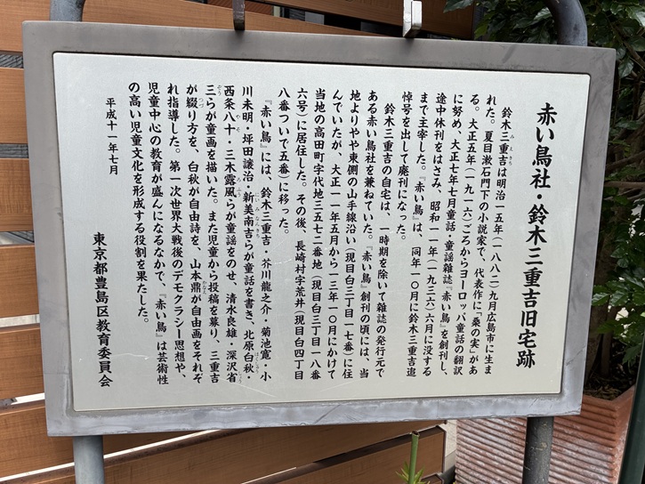 鈴木三重吉は明治十五年(1882年)九月広島市に生まれた。夏目漱石門下の小説家で、代表作に「桑の実」がある。大正五年(1916年)ごろからヨーロッパ童話の翻訳に努め、大正七年七月童話・童謡雑誌「赤い鳥」を創刊し、途中休刊をはさみ、昭和十一年(1936年)六月に没するまで主宰した。「赤い鳥」は、同年十月に鈴木三重吉追悼号を出して廃刊になった。鈴木三重吉の自宅は、一時期を除いて雑誌の発行元である赤い鳥社を兼ねていた。「赤い鳥」創刊の頃には、当地よりやや東側の山手線沿い(現目白三丁目十七番)に住んでいたが、大正十一年五月から十三年十月にかけて当地の高田町字代地三五七二番地(現目白三丁目十八番六号)に居住した。その後、長崎村字荒井(現目白四丁目八番ついで五番)に移った。「赤い鳥」には、鈴木三重吉・芥川龍之介・菊池寛・小川未明・坪田譲治・新美南吉らが童話を書き、北原白秋・西条八十・三木露風らが童謡をのせ、清水良雄・深沢省三らが童画を描いた。また児童から投稿を募り、三重吉が綴り方を、白秋が自由詩を、山本鼎が自由画をそれぞれ指導した。第一次世界大戦後のデモクラシー思想や、児童中心の教育が盛んになるなかで、「赤い鳥」は芸術性の高い児童文化を形成する役割を果たした。