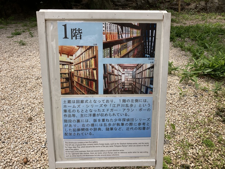 The storehouse contains a two-floor gallery. The left side of ground floor contains mainly foreign books, such as the Sherlock Holmes-series, and the works by Edgar Allan Poe, which became the source of the pen name "Edogawa Rampo" which are stored on the left side of the gallery. At the back of the staircase, there are several editions of youth detective series. On the right-hand side shelves, there are books which Rampo used as reference works when he was writing, such as crime reports and dictionaries but also several essay collections.