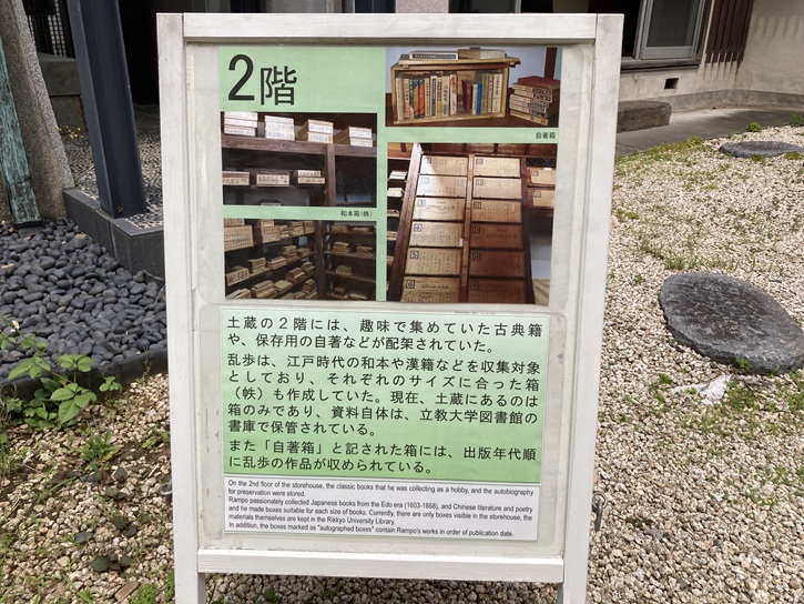 土蔵の2階には、趣味で集めていた古典籍や、保存用の自著などが配架されていた。乱歩は、江戸時代の和本や漢籍などを収集対象としており、それぞれのサイズに合った箱(帙)も作成していた。現在、土蔵にあるのは箱のみであり、資料自体は、立教大学図書館の書庫で保管されている。また「自著箱」と記された箱には、出版年代順に乱歩の作品が収められている。