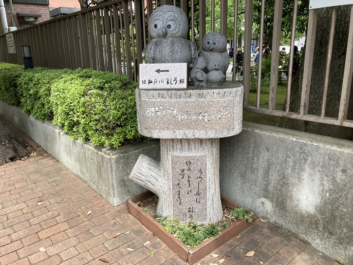 豊島区内のあちこちに、「ふくろう」と「みみずく」の像が置かれています。立教大学5号館角の旧江戸川乱歩邸に向かう通りに、「梟の樹を創る会」によるふくろう像(第4号)が設置されています。また、立教大学にほど近い西池袋公園には、豊島区政施行80周年を記念して記念碑が建立されています。ちなみに、作詞者は立教小学校六年生だそうです。