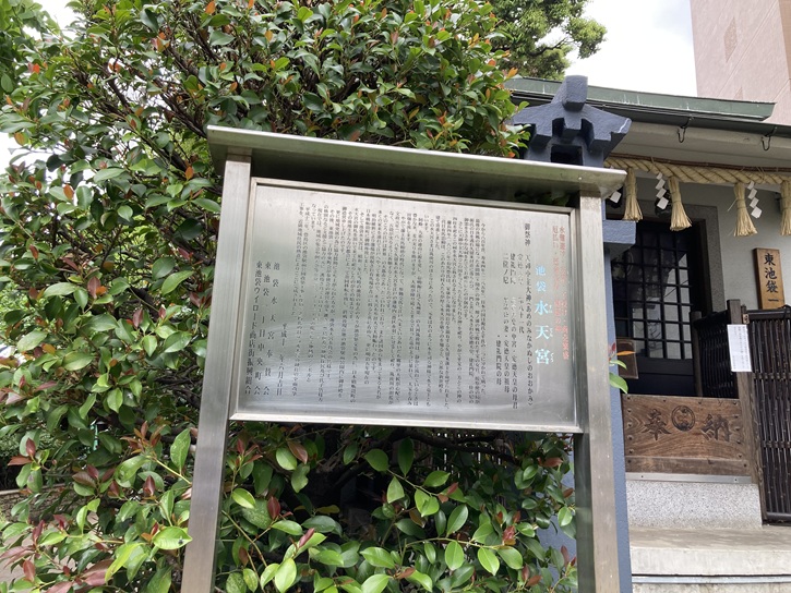 今から八百年昔、寿永四年(1185年)、日本の国は源氏と平氏の二つに分かれて戦った。最後の決戦の場になった赤間関(下関市)の沖合、壇ノ浦の戦で敗れた平家の女官、按察使の局が源氏の目を逃れ久留米付近に落ちのび、一門と共に入水された安徳天皇、建礼門院、二位の尼の御霊をささやかな祠をたててお祀りしたのが創めです。さらに天御中主大神(この国をつくったと伝えられる神)を祀り、やがて平家の三方とこの神の四柱を祀るこの祠を水天宮と称されるようになりました。慶長四年(1600年)有馬豊氏は、家康から筑後川沿岸を領有する久留米藩主を命ぜられました。二代目有馬忠頼は、このあたりの村人たちが厚く水天宮を敬うのを知ると、立派な新社殿を建て寄進しました。この水天宮さまは筑後川のほとりにあったので、元来は名のように水を司る神様で水天竜王ともいいます。阿蘇、九重の連山に源を発し、有明海に注ぐ九州第一の大河筑後川は、静かに流れているときは豊かな米、麦の実りを助けますが、大雨が降り続くとまるで狂った竜のように暴れて、人家を呑み田畑を流します。やがて藩主有馬頼徳の時代になって、参勤交代で江戸へ来ているあいだも郷里の天候が心配で、文政元年(1818年)久留米の水天宮を江戸の藩邸内(港区赤羽)に分霊して祀り、筑後川の氾濫がなく、五穀が実るように祈願することにしたのです。そのころの江戸は世界一の大都市であったといわれており、また諸国から集まって来る大名が多くの家来を連れて江戸へやって来るので、水天宮も参拝人で大層賑わったのです。明治維新により藩邸が接収され有馬邸が青山に移ると共に青山へ、さらに明治五年現在の日本橋蛎殻町に御鎮座致しました。そして池袋水天宮は、昭和三年に当時の池袋の有志の方々が池袋繁栄策の為に、日本橋蛎殻町の水天宮の御礼を頂いて来てお祀りしたのがその始まりです。その後地主さん方の都合によって数回移転を致し、終戦後現在地の池袋駅前公園内に御社殿を御造営申し上げたのです。更に地域発展の為に協力援助に立ち上がられた方々が、池袋水天宮奉賛会の皆様です。その後、東池袋一丁目中央町会が奉賛会の運営を引き継ぎ、豊島区及び地域住民及び氏子皆様方の格別なるご支援とご協力の元に、護持されてまいりました。現在では、地域の集会や例大祭等を介して、コミュニティの場として地域のシンボルとなっています。平成十二年、豊島区の池袋駅前公園改築工事に伴い、老朽化の目立つ水天宮の御社の全面改築工事を、近隣地域住民の熱意によりここに完成されました。