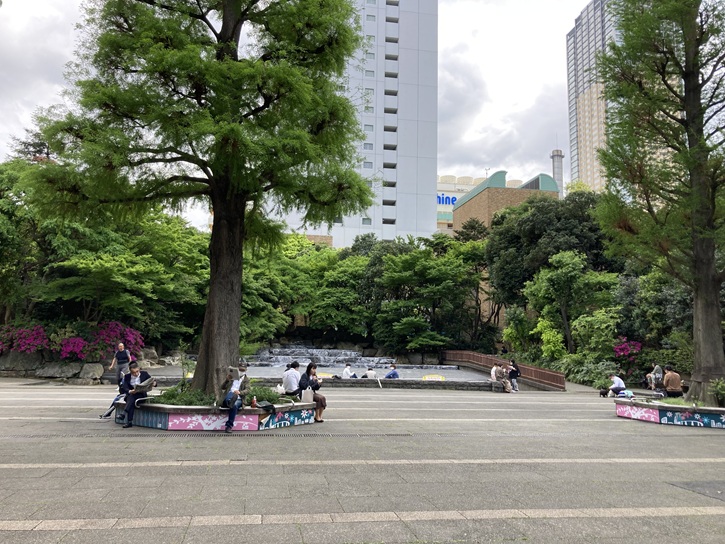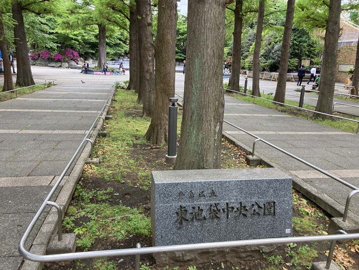 東池袋中央公園は、巣鴨刑務所跡地の再開発事業により、サンシャイン60などのビルとともに造られました。周囲を鬱蒼と茂る森が囲み、街の雑踏から隔離された静かな公園です。遠くから眺めると、遙か池袋の天を仰ぐサンシャイン60とプリンスホテルの足元を彩る小さな森のようです。近代的なこの公園に梢を連ねる樹木はセコイアを始め、モッコクやヤマモモ・マテバシイなどで、特に正面 入口付近に列植された24本のラクウショウは秋の紅葉が見所です。他に、都内では希少なセコイアセンペルビレンスも見られます。秋にはエントランスのラクウショウ並木が赤茶色に染まり、冬には葉を落として季節の移り変わりを教えてくれます。広々とした園内には黒い自然石で作られたカスケード風の池があり、小さな滝のように水が流れ、落ち着いた雰囲気です。水の音や、キラキラと光る水面の太陽がロマンチックな時を演出します。少しだけ雑踏を離れ、のんびりと日向ぼっこや緑の散策が楽しめます。