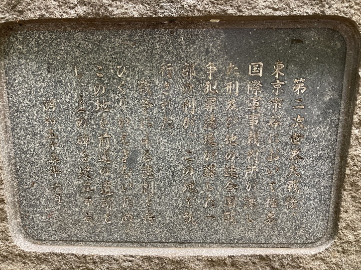 第二次世界大戦後、東京市谷において極東国際軍事裁判所が課した刑及び他の連合国戦争犯罪法廷が課した一部の刑が、この地で執行された。戦争による悲劇を再びくりかえさないため、この地を前述の遺跡とし、この碑を建立する。