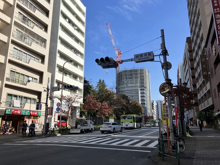 谷端川南緑道の先に坂が上がっています。祥雲寺坂は、池袋三丁目と西池袋五丁目の間に位置する長さ150mほどの要町通りの坂で、坂名は祥雲寺の前にある坂ということに由来します。坂名を書いた標識はありませんが、坂の途中の交差点に「祥雲寺坂」の名前が残っています。