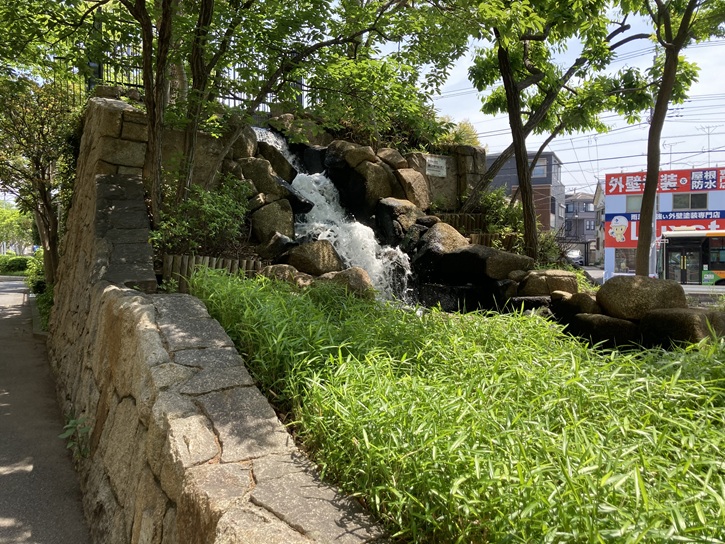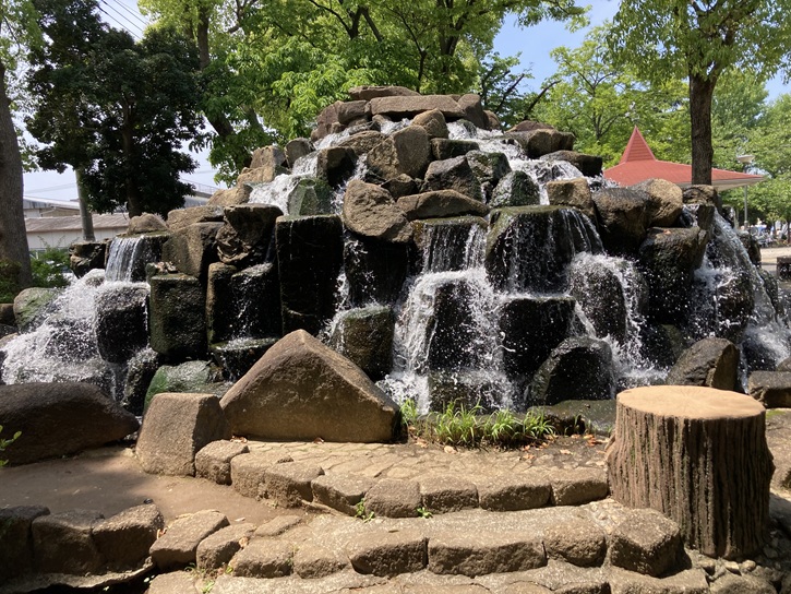 遊歩道には、ベンチを備えた休息スペースもあります。小松川境川親水公園の水路を流れる水は、濾過した自然水が使用されています。綺麗な水が岩山から滝となって流れ落ちています。