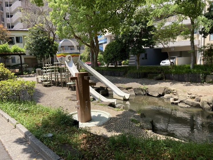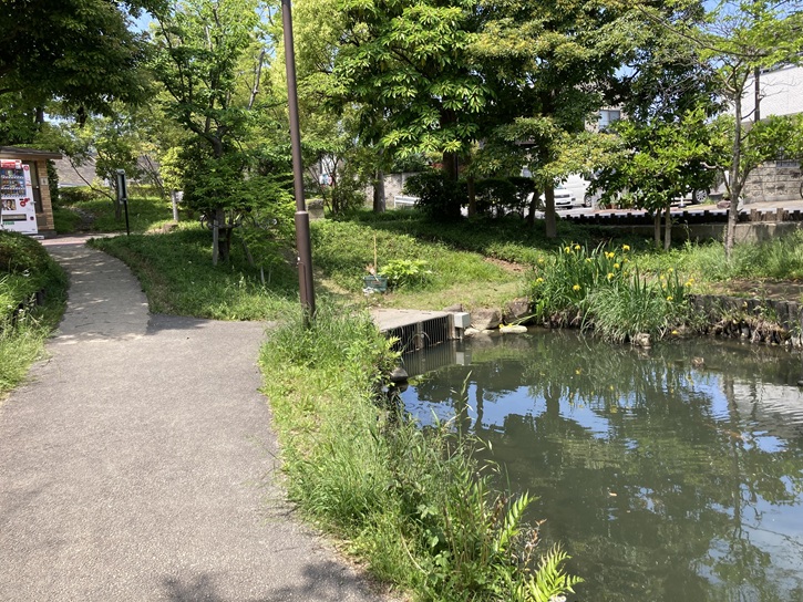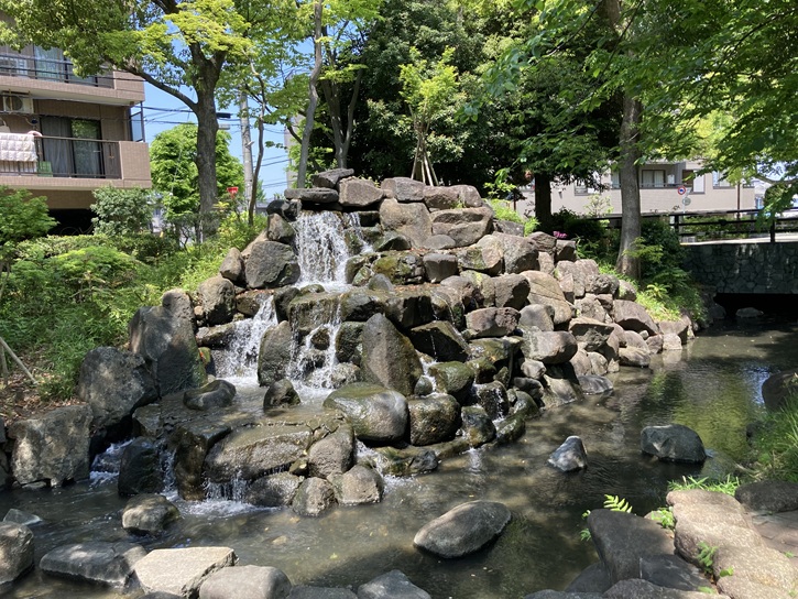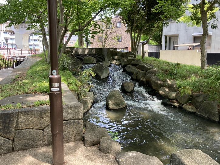 遊歩道の起点には水路に水を流すための小滝が設けられています。公園を流れる清流は、新中川の水を大杉浄水場で浄化したものだそうです。