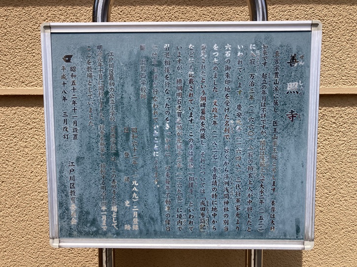 江戸川区最初の公立小学校「葛西学校」は、この善照寺を教場として、明治九年十月に開校しました。校舎を新築し、移転する明治十四年十一月までここを教場としていました。