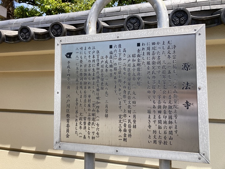 源法寺は、天正四年(1576年)に故嶽によって開山されました。その後、江戸時代初期に観智国師や信蓮社覚誉によって中興されました。源法寺は「堀まき寺」と呼ばれています。寛政九年(1797年)の火事で寺宝を失ってしまったため、防火用として堀を巡らしたことに由来します(現在は堀は埋め立てられ存在しません)。