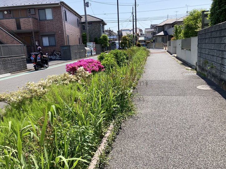スタート地点の宿川親水緑道入口から歩き始めます。宿川親水緑道入口は、篠崎街道の江戸川二丁目「宮下」バス停から住宅地の路地を少し進んだ先にあります。