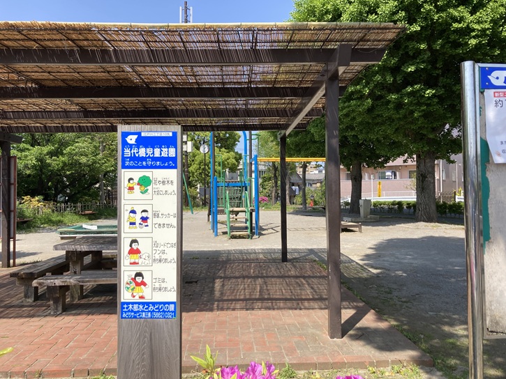 緑道の末端にある当代橋児童遊園にやってきました。当代橋児童遊園も宿川親水緑道と合わせて改修され、アスレチック遊具や長いローラーすべり台が設置されました。屋根のついたテーブル付きのベンチは、おやつや軽食をとってピクニック気分を味わったり、荷物を置いたりするのにとても便利です。