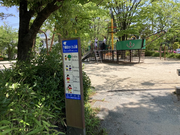 スタート地点の下鎌田さくら公園から歩き始めます。下鎌田さくら公園は、船の形の複合遊具や、くじらやイルカのかたちをモチーフにしたスプリング遊具など、公園全体に「海」にまつわる遊具が沢山設置されています。入り口には波止場のようなモニュメントが並んでいて、特に子ども達に人気なのは、ドクロのマークが印象的な海賊船の遊具です。なんと、舟にはローラーすべり台が付いていて、水色と白で構成されているローラー部分は、海を泳ぐ魚が表現されています。滑る時に、まるで魚と一緒に泳いでいる気分になれます。海賊船には見晴台やターザンロープがあり、舟の横には階段の他、梯子や網目状のロープなどの豊富な登り口があり、錨のマークや船の大きな舵輪が付いていたりと海賊ごっこも楽しめます。船の下の部分は骨組みのようになっていて閉塞感がなく、付き添いの人は子どもが何をしているか見れますので安心です。