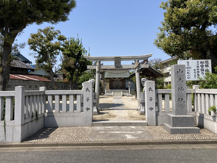 下鎌田さくら公園に向かい合って山王神社があります。門前の社号碑には「山王神社」と書かれていますが、大鳥居の扁額には「日枝神社」と「三峯神社」の二社が併記されています。どちらも山の神様です。